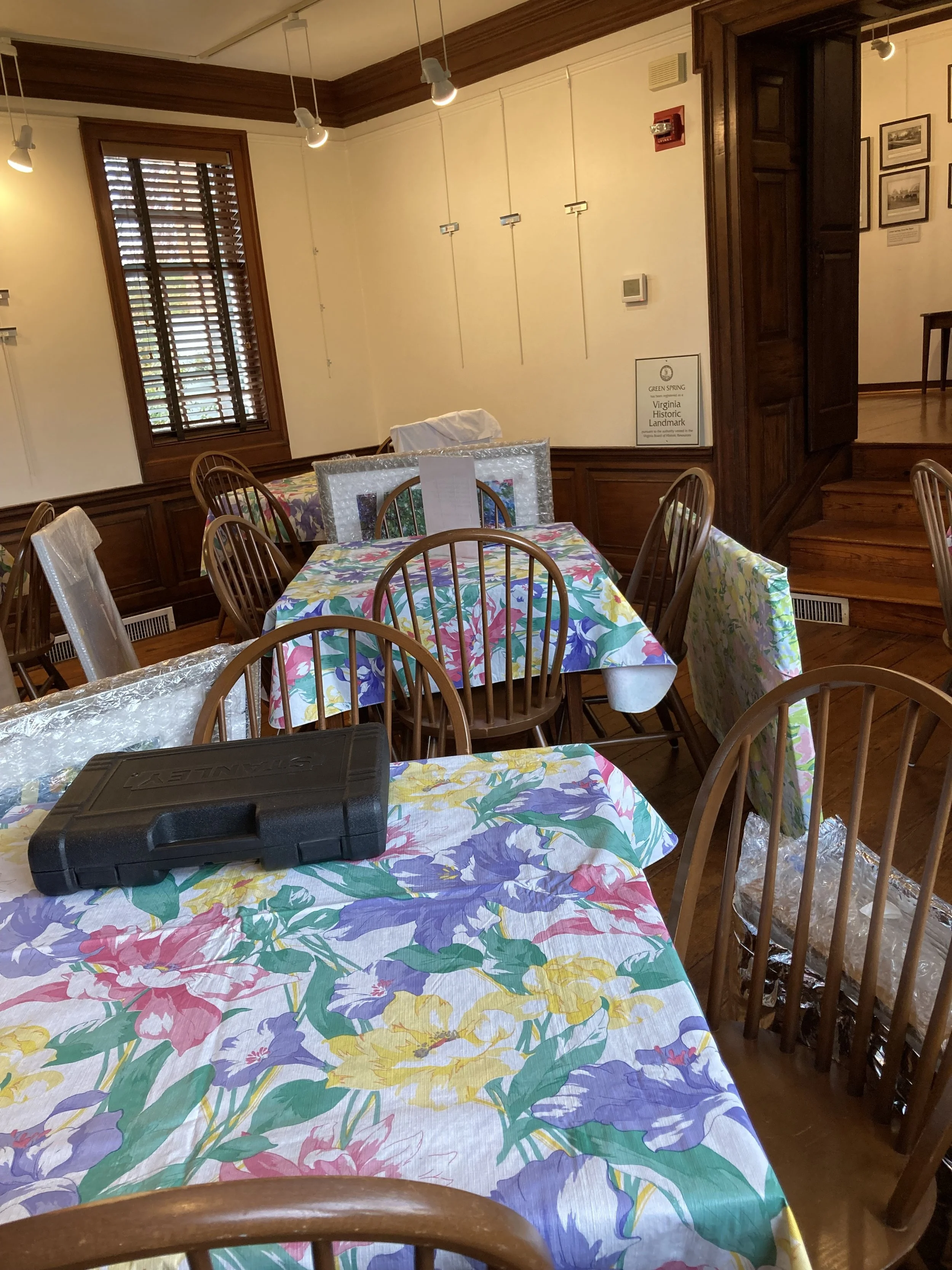 Monday’s focus was on hanging my part of the “Feathers and Petals” show at Green Spring Gardens (you can read more about that in my Art on Display page). Planning the show goes on for months, literally, making decisions about what the show should look like, which of my paintings would further that vision, and then, in turn, were there ones that needed to be framed? Yes, three. Were there ones I would like to take but don’t have room for (yes, two, at least). I’d been framing, packing, writing up my inventory over the past few weeks, and Monday morning was packing time. Carefully, carefully fitting nine paintings into the car, remembering the tool kit, the paperwork, the labels…